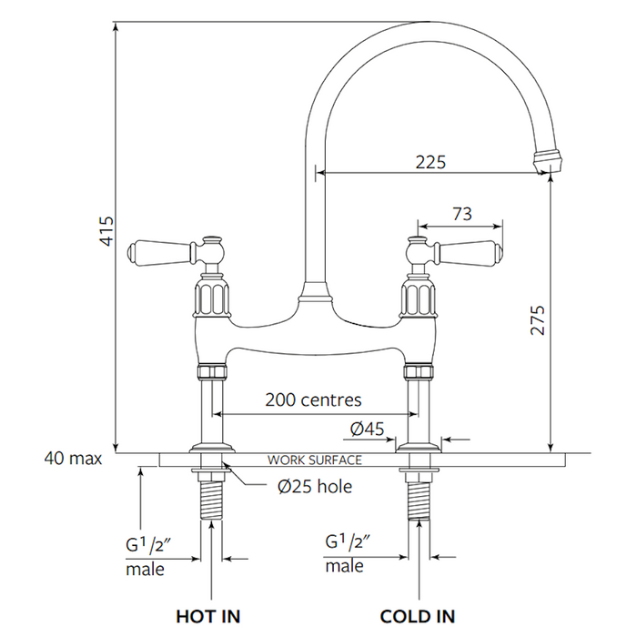 Versatile and timeless, the Shaws by Perrin & Rowe Pendleton is a classic design that works well in both modern and traditional settings. The Pendleton is a large deck-mounted bridge mixer with a sweeping swan neck and porcelain lever handles, perfect for larger and double bowl sinks. The design includes delicate ribbed detailing on the faucet handle and spout, along with a Shaws brand insignia and temperature indicator on each porcelain handle.