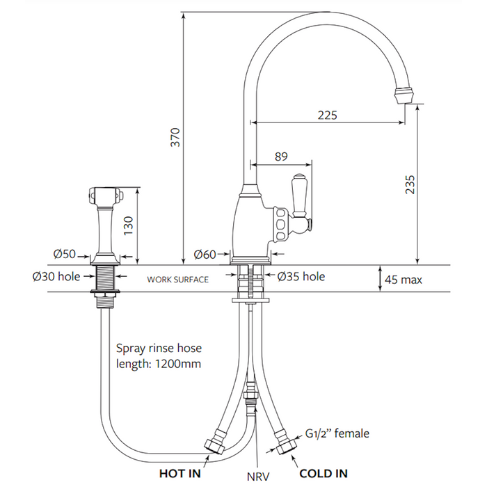 The additional bench-mounted spray rinse tap features a flexible 1.2m hose and a simple diverter button which can be activated with a press of your thumb. The water ceases to run through from the main tap, activating the spray rinse to make filling pots, rinsing vegetables, watering plants and washing oversized dishes fuss-free and simple.